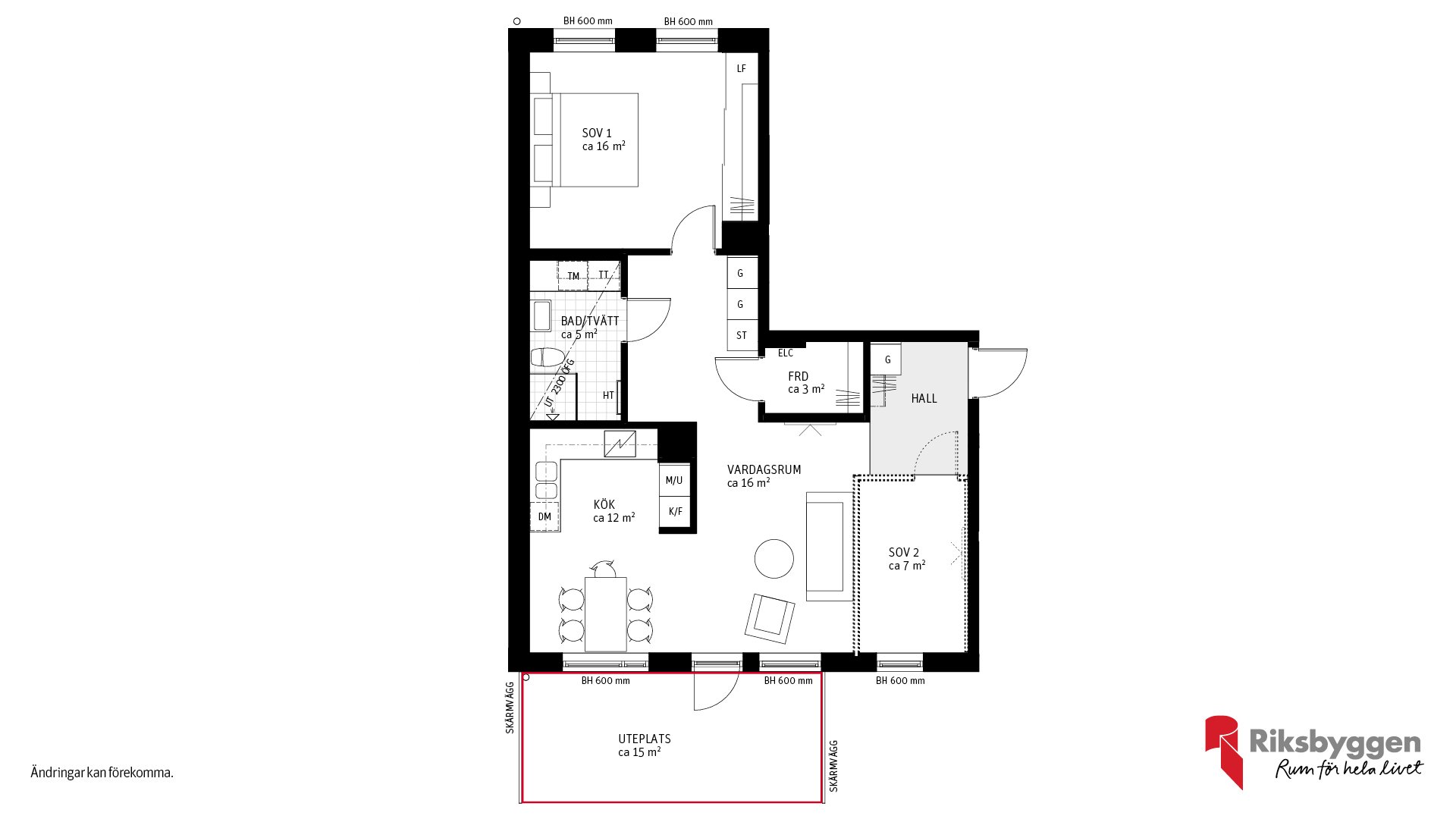 En rymlig trea om 75 kvm med stor uteplats på ca 15 kvm i söderläge. Rymlig hall med garderob. Vardagsrum med utgång till uteplats. Här finns möjlighet att göra val om frånval av sovrum 2 till förmån till ett större vardagsrum. Kök med plats för matgrupp. Sovrum 1 med skjutdörrsgarderob. Sovrum 2. Badrum med tvättmaskin och torktumlare.