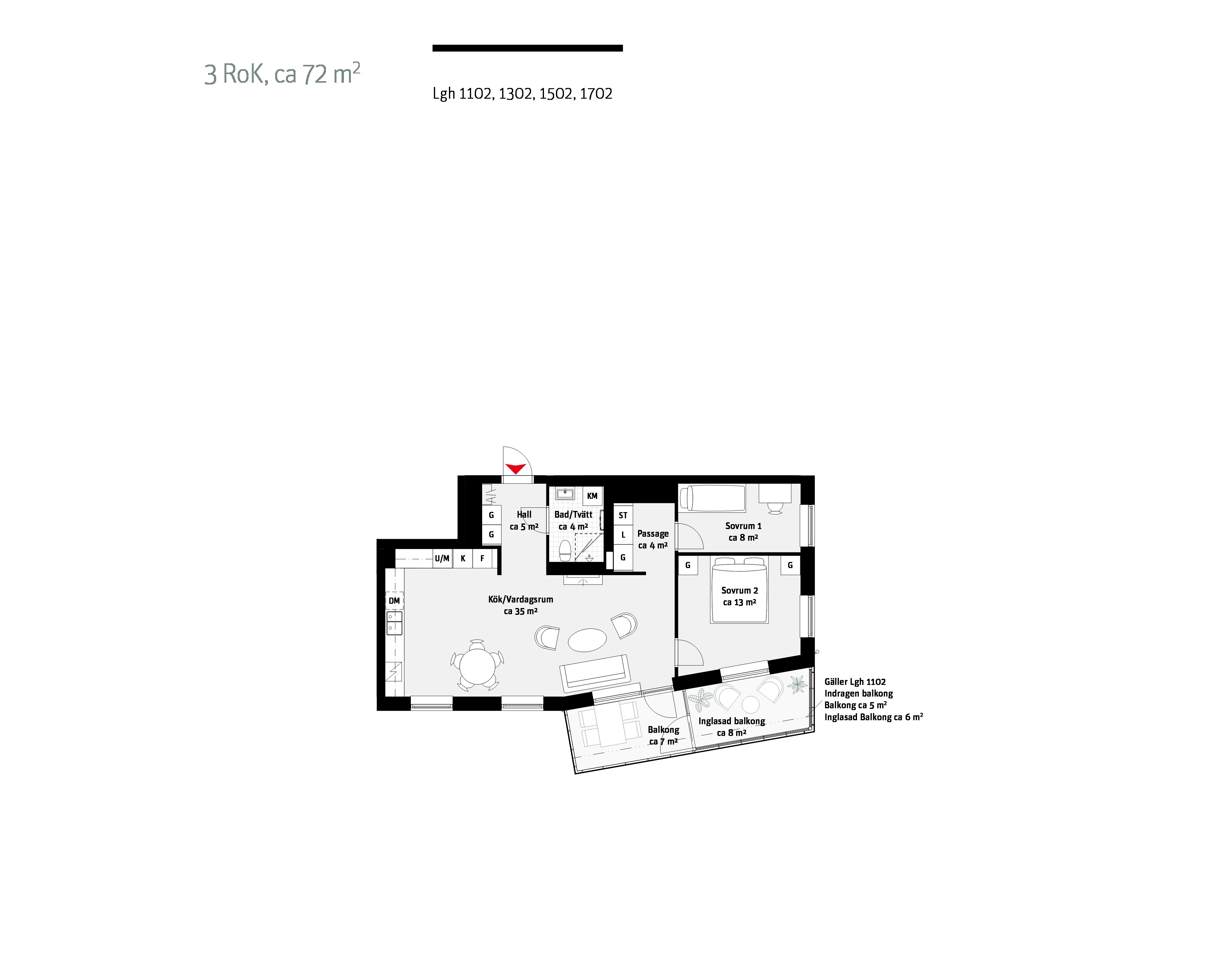 • 3 rum och kök 72 kvm: Lägenhet 1102, 1302 och 1502