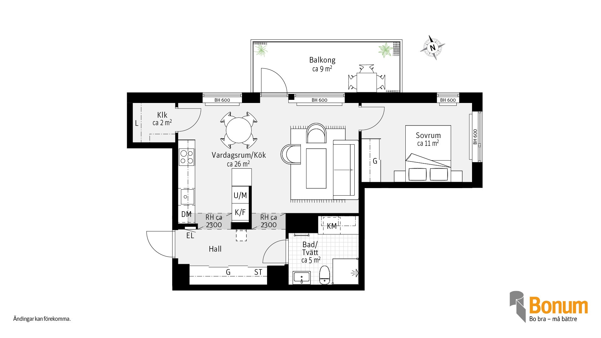 Välplanerad gavellägenhet med fönster i två väderstreck, 2 rum och kök om 53 kvm, med inglasad balkong som vetter mot innergården. Öppen planlösning mellan vardagsrum och kök. I vardagsrum/kök finns utgången till balkongen. I hall och sovrum finns rymliga skjutdörrsgarderober men det finns dessutom en klädkammare. I badrummet finns tvättutrusning.