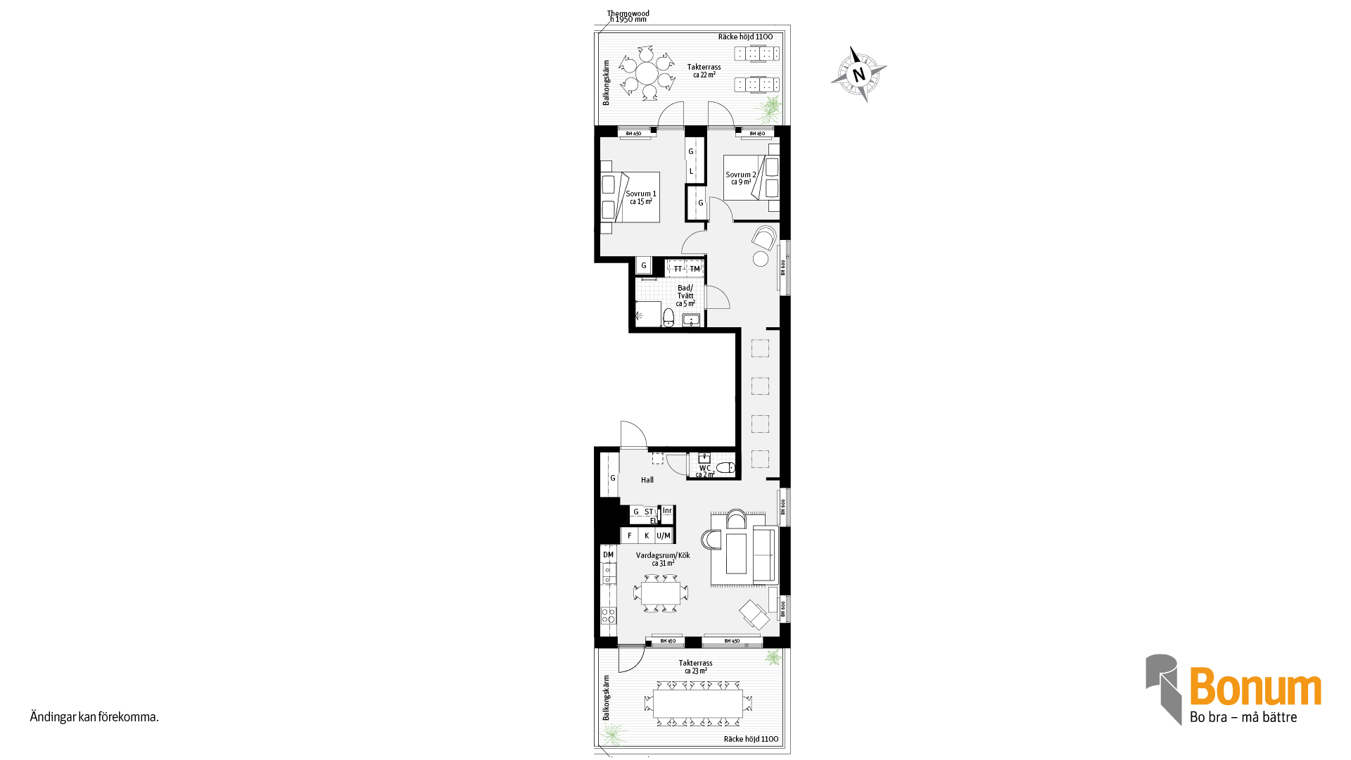 Gavellägenhet med villakänsla på översta våningen med fönster i tre väderstreck. Lägenheten har två terrasser i olika väderstreck. Lägenheten har en tydlig uppdelning mellan den privata och sociala delen, genom en hall med takfönster som binder samman de båda delarna. Kök och vardagsrum i öppen planlösning med utgång till terrass. Vid lägenhetsentrén finns ett gästwc. I den privata delen finns 2 sovrum med access till terrass. Här finns ett badrum med tvättmaskin och torktumlare.