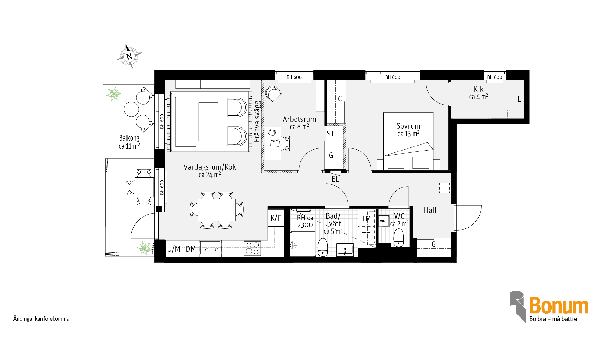 Gavellägenhet med fönster i två väderstreck, 3 rum och kök om 70 kvm, med delvis inglasad balkong. Kök och vardagsrum i öppen planlösning i anslutning till balkongen. Arbetsrummet kan väljas bort om du vill ha ett större vardagsrum. Förvaring sker i skjutdörrsgarderober men dessutom finns en klädkammare. I badrummet finns torktumlare och tvättmaskin. Gästwc finns vid lägenhetsentrén.