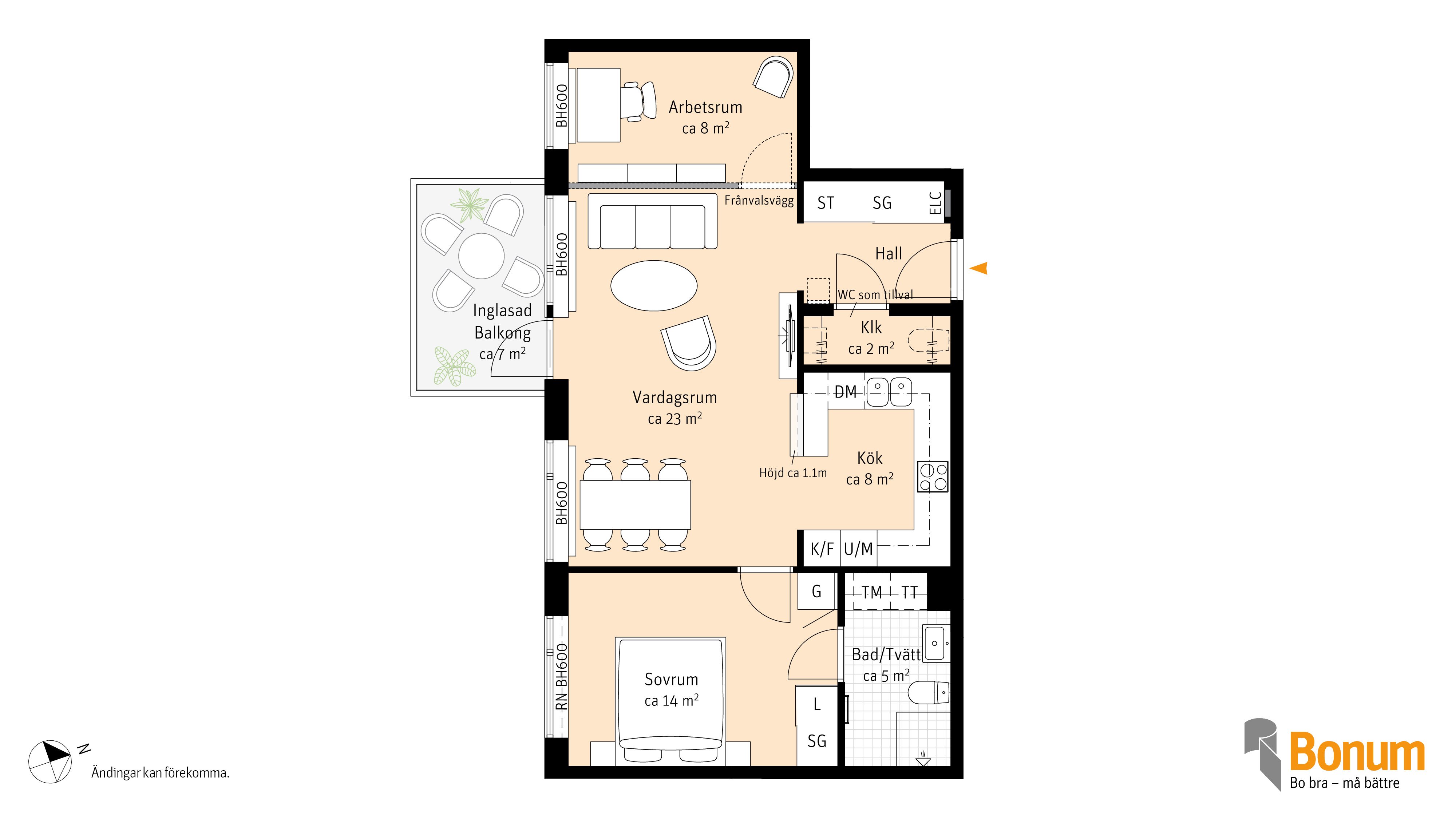 Smart planerad trea med ett större och ett lite mindre sovrum. Det rymliga vardagsrummet utgör navet i hemmet och har utgång till den inglasade balkongen där du kan njuta av uteliv nästan året runt. Köket är välplanerat med gott om förvaringsutrymme, diskmaskin, kyl/frys och mikro. Badrummet är välplanerat och funktionellt med duschhörna, tvättmaskin och torktumlare. I lägenheten finns också en klädkammare som erbjuder smart förvaring.