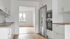 Köket är utrustat med vita köksluckor från Vedum, laminatbänkskiva med trästruktur och ovanför arbetsytorna sitter ett matt vitt kakel i liggande sättning Diskmaskinen är integrerad för ett enhetligt intryck och samtliga vitvaror är i rostfritt utförande: induktionshäll, inbyggnadsugn, mikro samt kyl och frys i fullhöjd. Spiskåpan är av modellen Pandora Green Flow, en energieffektiv och tyst lösning som monteras diskret bakom skåplucka för att bibehålla kökets rena linjer.