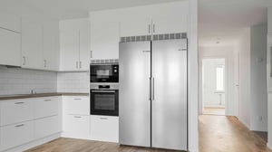 Köket är utrustat med vita köksluckor från Vedum, laminatbänkskiva med trästruktur och ovanför arbetsytorna sitter ett matt vitt kakel i liggande sättning Diskmaskinen är integrerad för ett enhetligt intryck och samtliga vitvaror är i rostfritt utförande: induktionshäll, inbyggnadsugn, mikro samt kyl och frys i fullhöjd. Spiskåpan är av modellen Pandora Green Flow, en energieffektiv och tyst lösning som monteras diskret bakom skåplucka för att bibehålla kökets rena linjer.