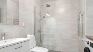 Helkaklat badrum med vitgrå kakel och ljusgrå klinker, duschvägg i klarglas, takdusch, handdukstork, kommod, spegelskåp med LED-belysning och wc. Här finns även tvättmaskin och torktumlare och ovanför maskinerna finns en praktisk laminatbänk med trädstruktur, perfekt för att enkelt och bekvämt sköta tvätten och ovan bänken finns även väggskåp för goda förvaringsmöjligheter.