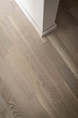 Rummen har vitmålade väggar och socklar. Golven har vitpigementerad, mattlackad 3-stavsparkett.