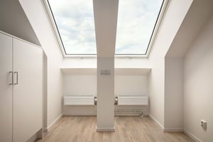 Rummen har vitmålade väggar och socklar. Golven har vitpigementerad, mattlackad 3-stavsparkett.