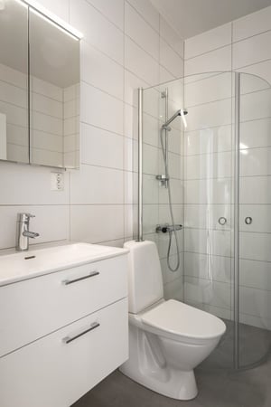 Även ditt nya badrum har inretts med omsorg om detaljerna. För att helhetsintrycket ska hålla stilen i hela lägenheten har våra inredare noga valt ut kakel och klinker så att det matchar inredningen i köket.