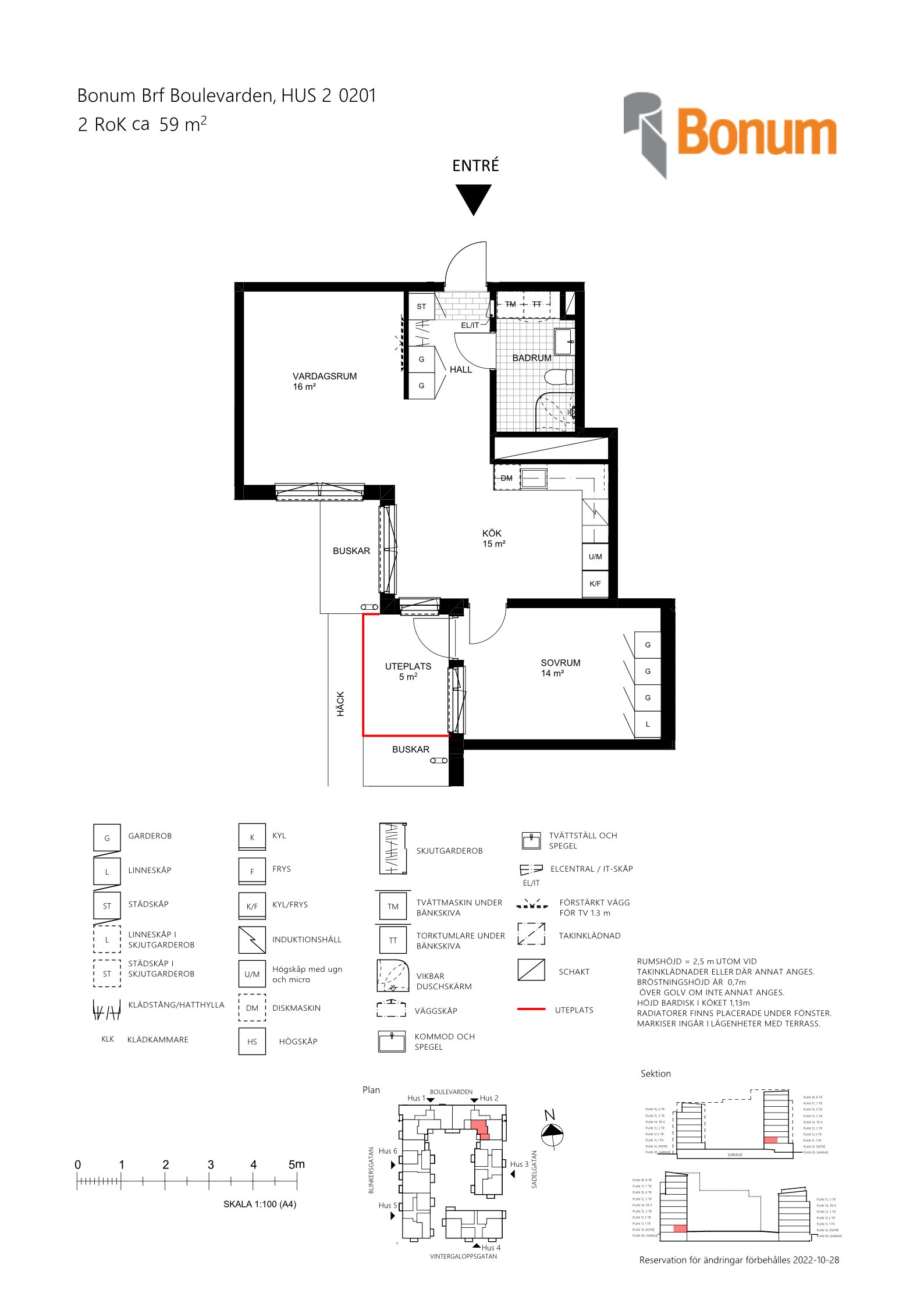 2:a på entréplan med uteplats i västläge mot prunkande gård. Hall med 1 kvm klinkergolv, hatthylla och två garderober. Från hallen nås badrum med inredningsstilen Harmoni med vitt kakel, ljusgrå klinker. Dusch med svängda dörrar, förhöjd wc, tvättställ med vit kommod, TM och TT. Sovrum om 13 kvm med god förvaring. Separat vardagsrum och kök. Köksinredning är i Harmoni med vita köksluckor och vitt kakel. Källarförråd tillhör bostaden.