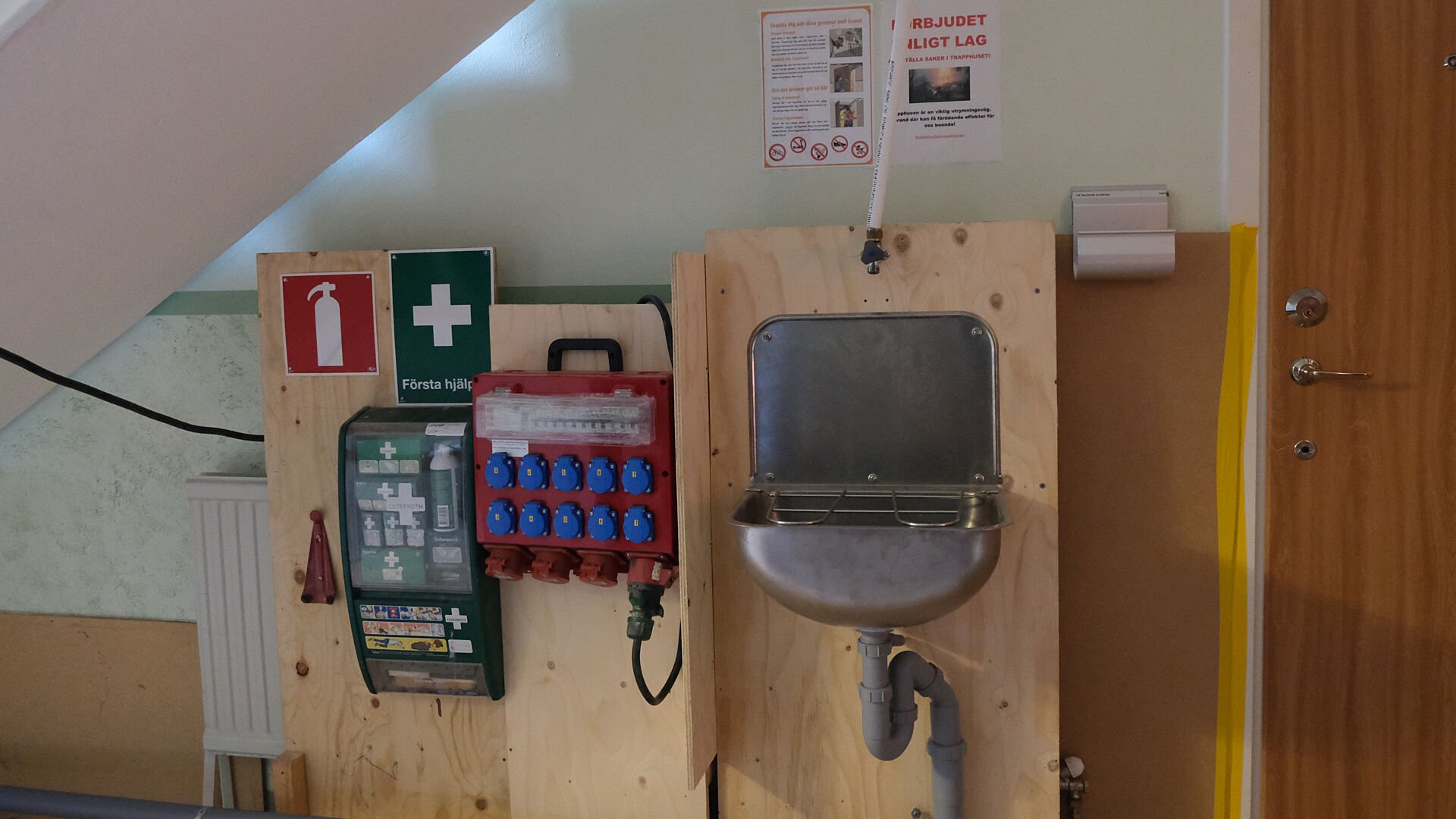 Under vissa perioder är vattnet avstängt i bostaden under ett stambyte, för att de boende ska slippa springa i trappor och hämta vatten i andra byggnader är en diskho med rinnande vatten monterad på varje våningsplan.