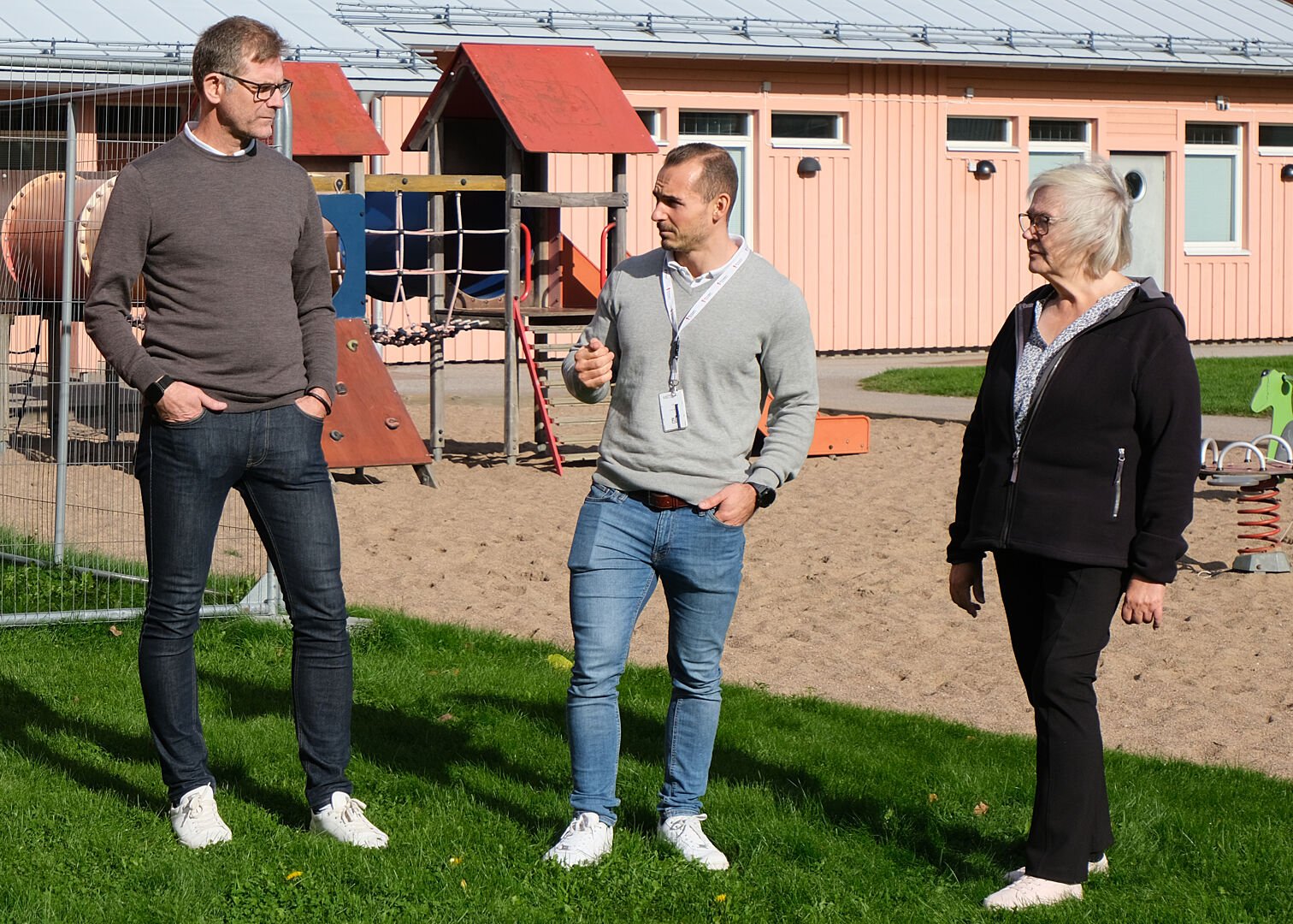 Jörgen Johansson och Alexander Hermansson från Riksbyggen samtalar med MajLis Göransson, ledamot Brf Ängsvallen.